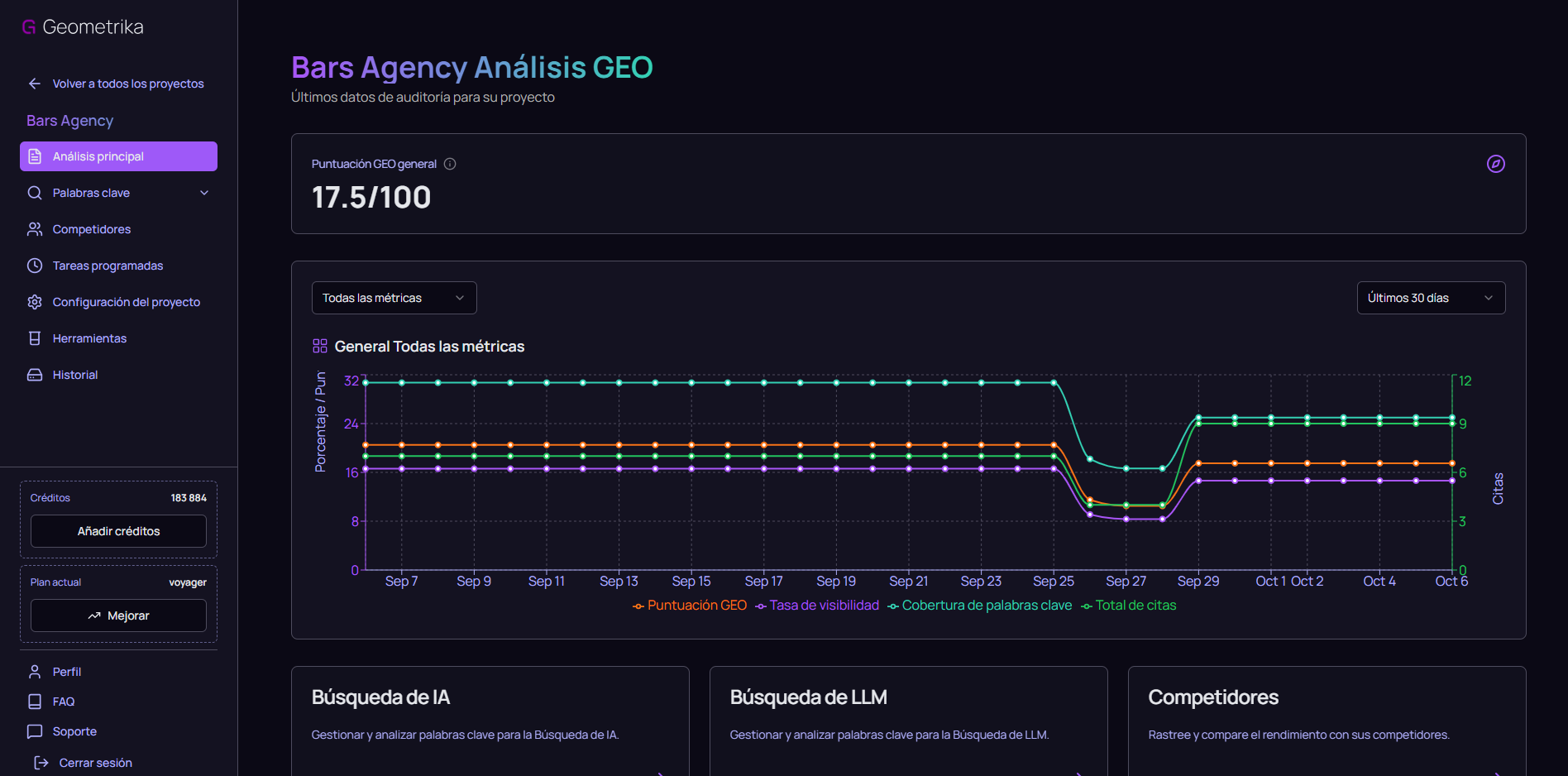 - Acción: Después de un período establecido (por ejemplo, un mes después de implementar cambios), realizas una auditoría de seguimiento en Geometrika usando los mismos grupos de consultas. Comparas las nuevas métricas con la línea de base que estableciste en la primera etapa.