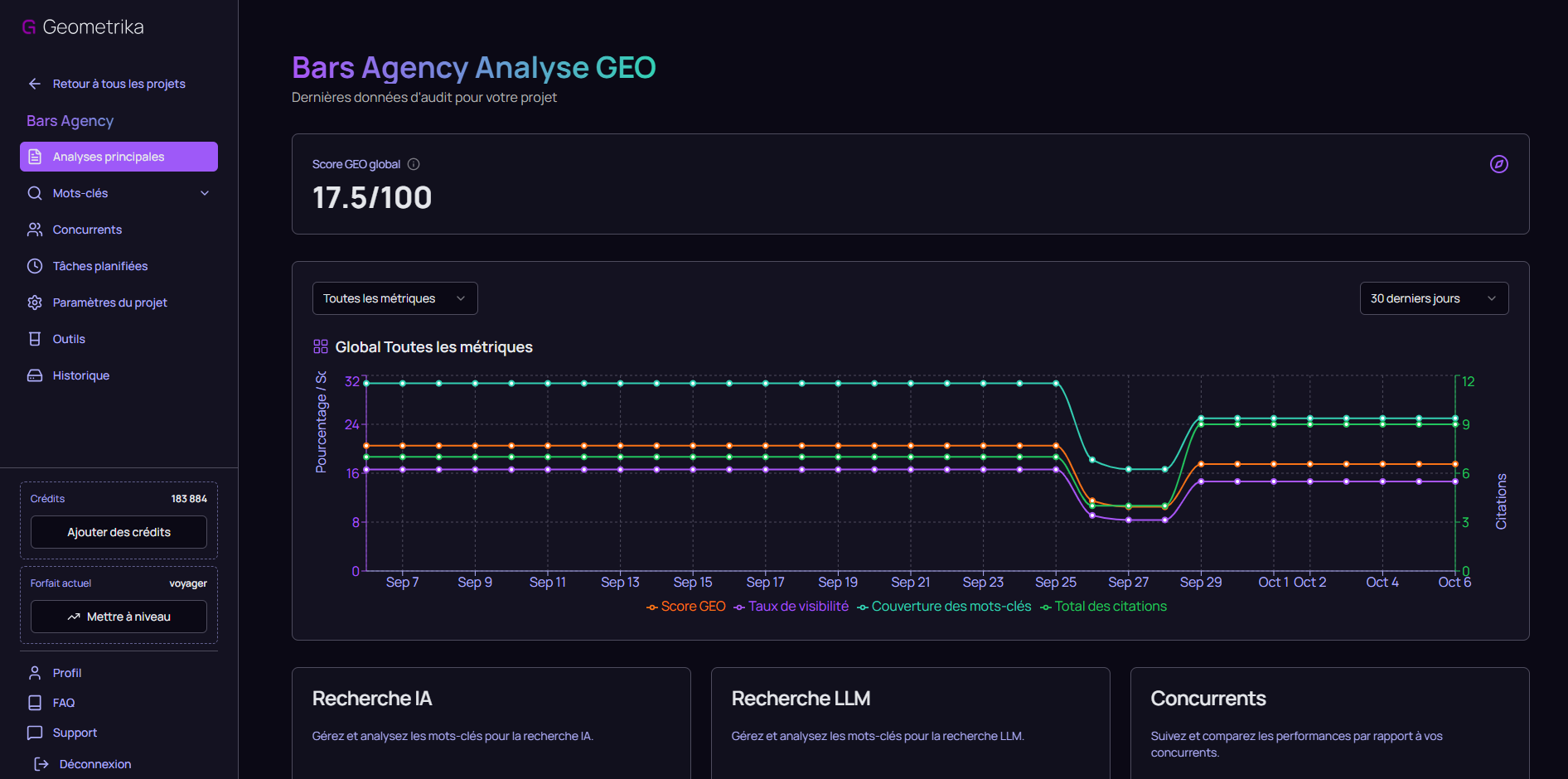 C'est votre instrument de navigation principal dans le monde du GEO. Il fournit une couche de données entièrement nouvelle que ni les plateformes d'analytique web ni les suites SEO classiques ne peuvent offrir.